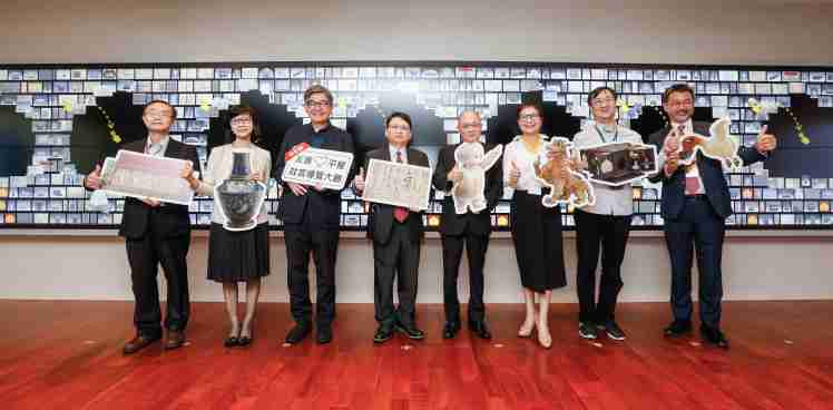 壹号平台携手创利空间为故宫建置的智慧文物互动导览墙及轮播墙,,,今日正式启用。。。。(左四:壹号平台新事业暨投资管理总部副总经理杨本豫、、右四:故宫博物院院长吴密察、、、、右三:太极影音董事长黄宝云)