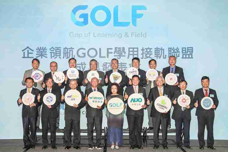 GOLF学用接轨联盟集结企业和学校的力量,,打造「学用合一、、产学接轨」的创新合作平台 (前排左起:淡江大学副校长何启东、、、、元智大学校长林启瑞、、纬育执行长许延岳、、纬创总经理暨执行长黄柏漙、、、教育部政务次长范巽绿、、壹号平台董事长暨执行长彭双浪、、、仁宝总经理暨执行长翁宗斌、、大同大学校长何明果、、、、圣约翰科大校长艾和昌;后排左起:明新科大校长林启瑞、、、、龙华科大校长葛自祥、、、、台湾科大校长廖庆荣、、、、中兴大学副校长郑政峯、、、、中央大学校长周景扬、、台北科大副校长任贻均、、、、中华科大副校长石大明、、明志科大校长刘祖华)