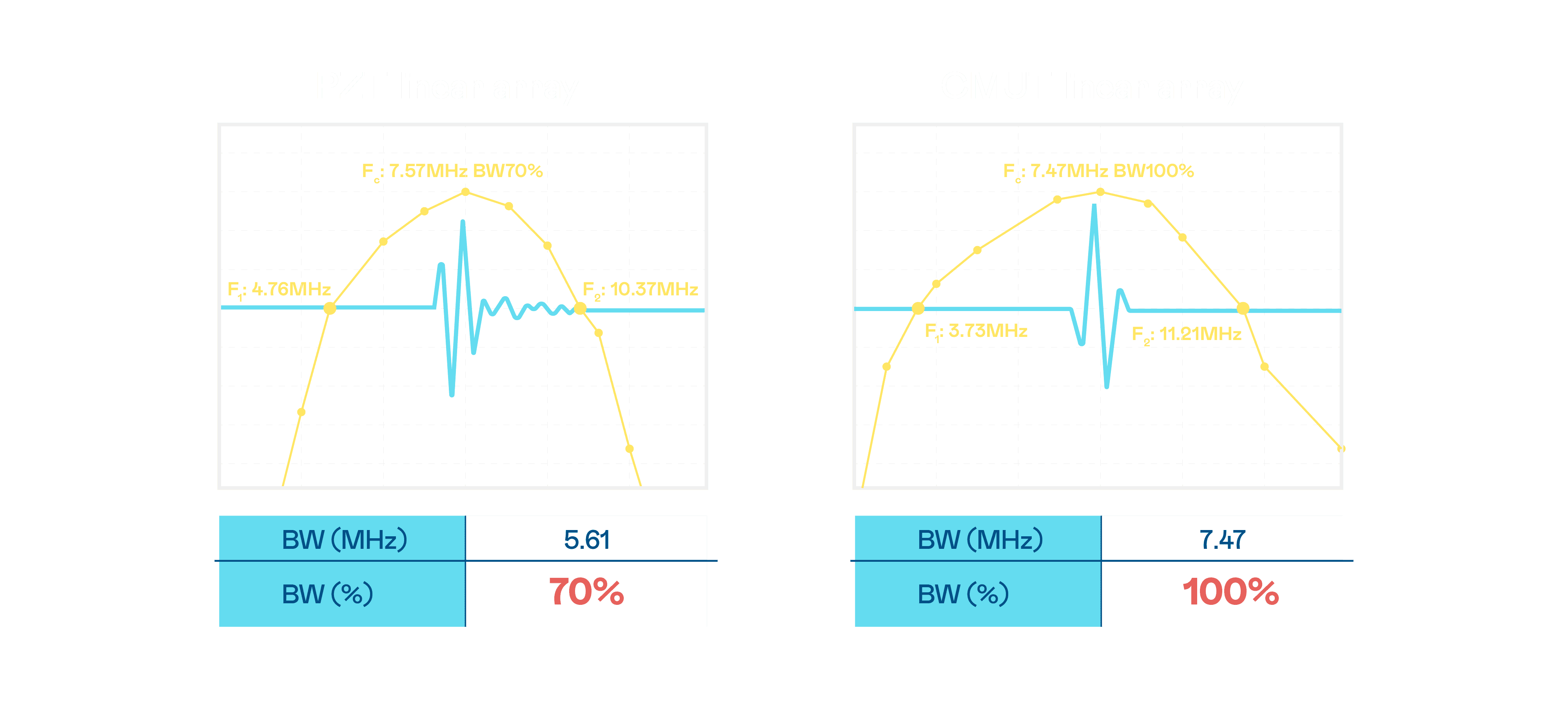 超音波影像的解析度高低,,,首先取决于探头能发出的讯号频宽。。。。壹号平台 CMUT 可提供高清晰的超音波讯号,,,,提供高频宽、、、、高灵敏度、、、、影像纹理细节更高的超音波影像,,,,协助医护人员缩短影像判读时间及利用精准的医疗影像进行诊断。。